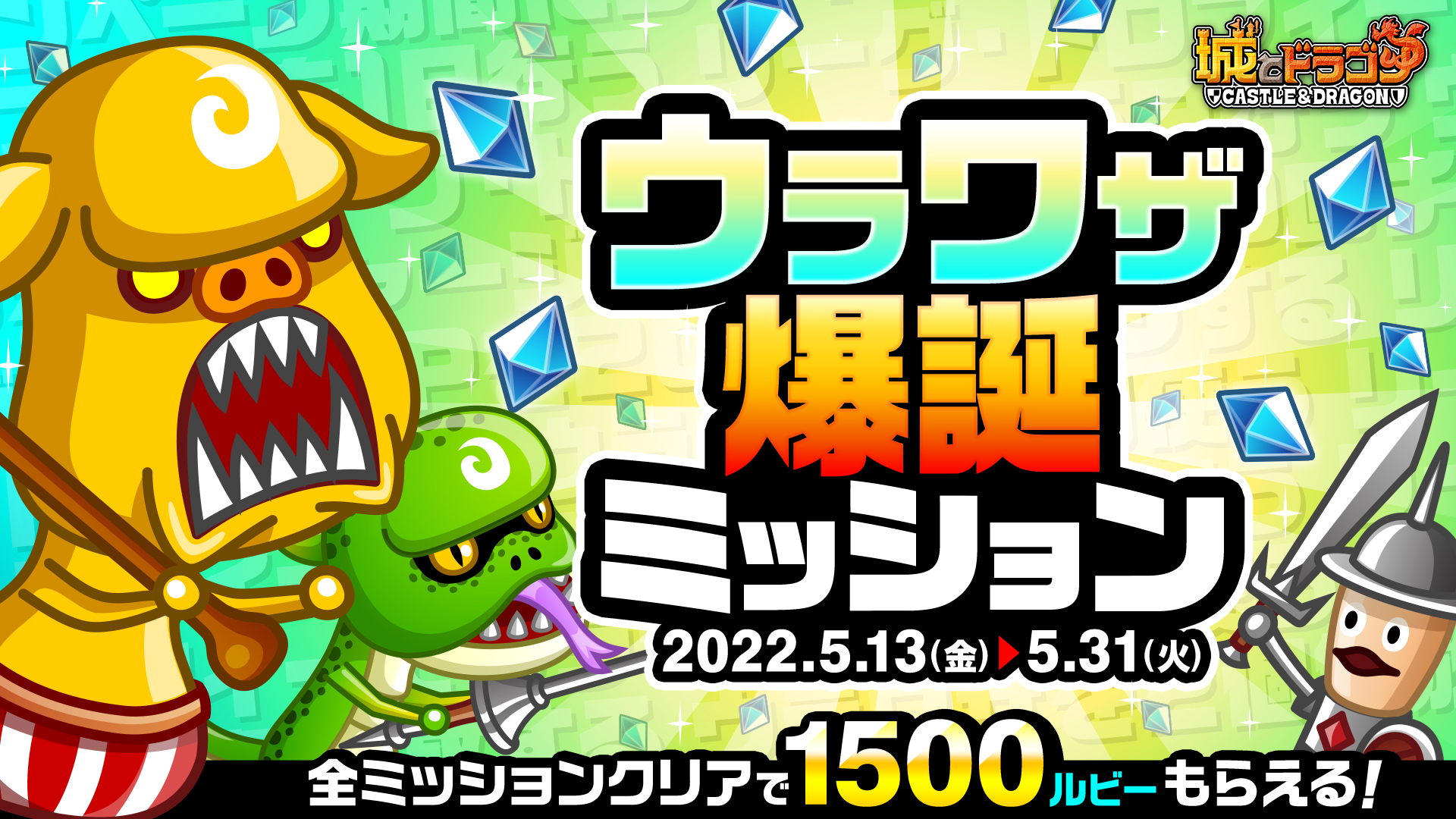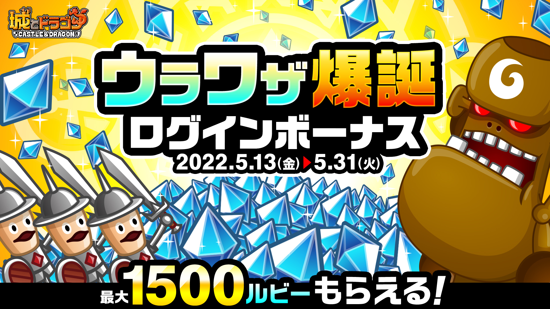 5月13日(金)メンテナンス後より、ゲームにログインすると、最大“1500ルビー”などがもらえる「ウラワザ爆誕ログインボーナス」を開催します。報酬は期間中1日1回、最大19日間プレゼントされます。
