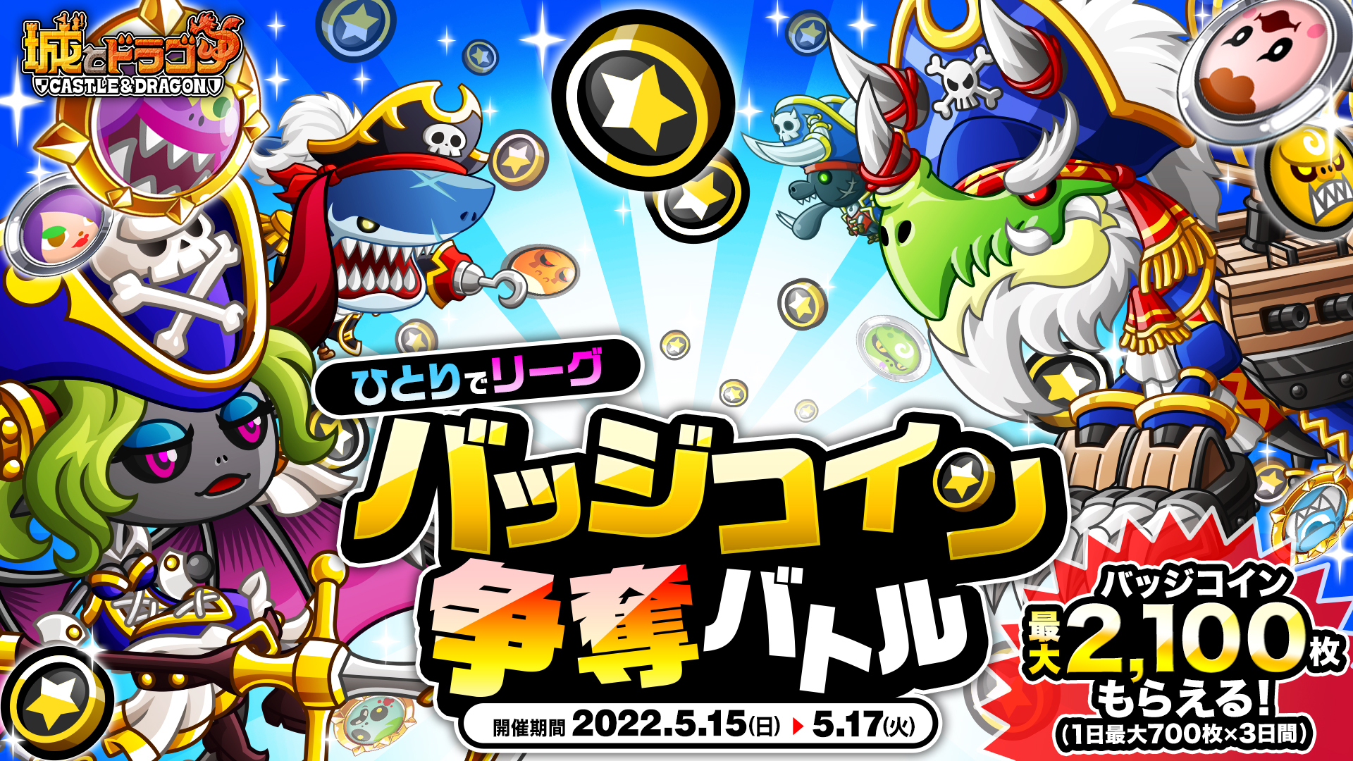 上記期間中“ひとりで”リーグに参加してバトルに勝利すると、報酬として1日5回まで“バッジコイン”が贈られます。1勝につき50枚、5勝目には500枚のバッジコインを必ず獲得できます。
