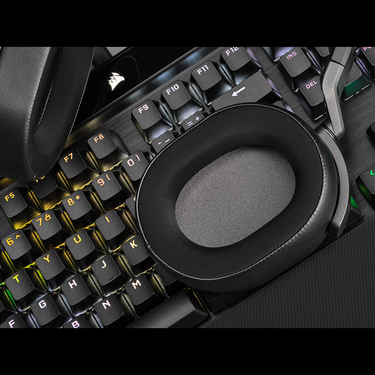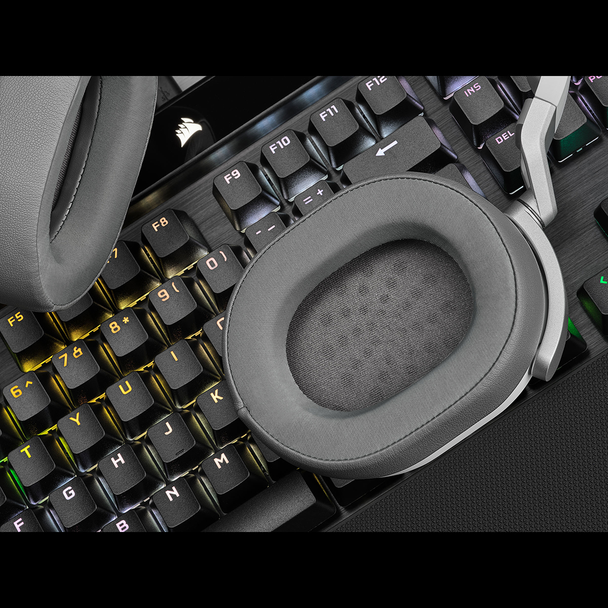 左イヤーカップの下部にボリュームコントロールを備え、マイクは上向きに畳むことで自動的にミュートされます。iCUEやWindowsの操作なしで、直感的なコントロールが可能です。