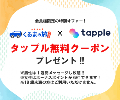 期間中「くるまの旅ナビ」に会員登録した方限定で、男性の方はタップルアプリ 1週間メッセージし放題の特別クーポン、女性の方はタップルアプリ100ボーナスポイントをプレゼント!