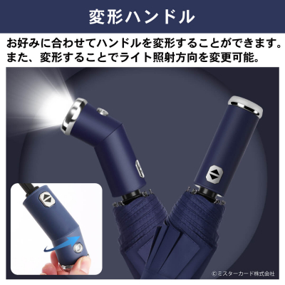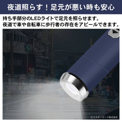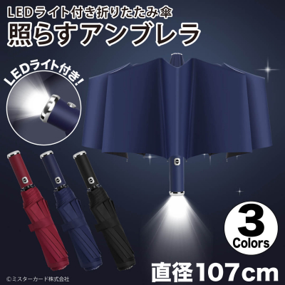 ミスターカード株式会社(本社所在地:埼玉県川口市)は、LEDライト付き折りたたみ傘「照らすアンブレラ」を2022年5月17日(火)から発売いたします。片手でボタンをワンプッシュで使えるLEDライトは夜間で足元を照らしながら、クルマや自転車に存在をアピールできます。大きいサイズの直径107cmなので、背負ったリュックもすっぽり隠れます。ハンドルも変形して、ライトの照射方向を変更可能。撥水加工、紫外線UVコーティング生地、丈夫な10本骨、重さは約480gです。ボタン電池CR2032×2個付属。カラーはブラック、ブルー、レッドの3色をご用意!