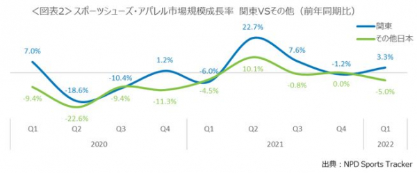 エヌピーディー・ジャパンのスポーツ事業部アカウントマネージャーである、伊藤和正(いとう・かずまさ)は、「2022年1-3月のスポーツシューズ・アパレルの市場規模は前年同期比1.8%減と、3年連続でのマイナス成長となりました。これは期間中でオミクロン株による感染者数が増加していたことによるものと考えられます。また市場の回復ペースは地域により異なっており、関東はコロナからの回復を見せているものの、関東以外のその他日本ではマイナス成長が続いています。しかし足元では3年ぶりの行動制限のないゴールデンウィークなど、人々の消費行動も徐々に活性化されつつあるようです。Q2以降では日本全体でのプラス成長が期待されます。」と話します。