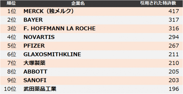 集計の結果、2021年に最も引用された企業は、1位 MERCK(独メルク)、2位 BAYER、3位 F. HOFFMANN LA ROCHE(以下表記ROCHE)となりました。