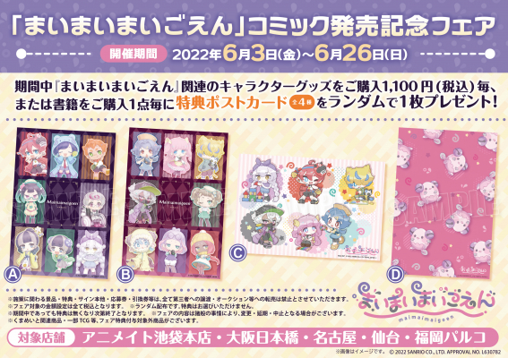 期間中、アニメイト池袋本店・大阪日本橋店・名古屋店・仙台店・福岡パルコ店にて『まいまいまいごえん』関連のキャラクターグッズをご購入1,100円(税込)毎、または書籍をご購入1点毎に[特典ポストカード(全4種)]をランダムで1枚プレゼント!