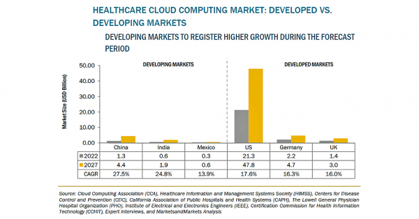 医療用クラウドコンピューティングの市場規模は、2022年の394億米ドルからCAGR17.8%で成長し、2027年には894億米ドルに達すると予測されます。医療用クラウドコンピューティング市場の成長は、主にCOVID-19によるEHR、電子処方、遠隔医療、mHealth、その他の医療用ITソリューションの採用拡大、ビッグデータ解析、ウェアラブル端末、IoTの採用拡大、ヘルスケア業界におけるクラウド導入の増加、クラウドコンピューティングが提供するデータの優れた保存・柔軟・拡張性、新しい支払いモデルの普及とクラウドによるコスト効率、医療給付制度設計の動的性質などの要因に牽引されています。一方、データとセキュリティに関する懸念や、クラウドデータセンターに関する複雑な規制は、市場の成長をある程度抑制すると予想されます。