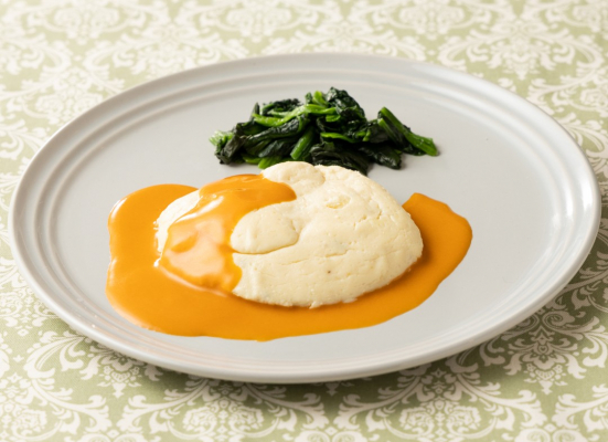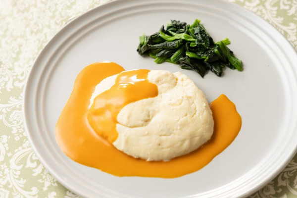 フランス料理のひとつ、ムースリーヌ。Bon Quishでは皮を取った真鯛の身をホタテとともに細かく丁寧に撹拌し、卵黄と生クリームをやさしく混ぜ合わせてムース状に仕上げました。こちらの商品は、お魚とソースを分けて包装していますので、一緒に湯せん調理の上、お好みのお皿に真鯛のムースリーヌと付け合わせのほうれん草を盛り付け、最後にたっぷりとアメリケーヌソースをムースにかけてお召し上がりください。