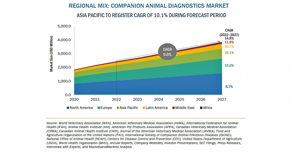 コンパニオンアニマル診断薬の市場規模は、2022年の24億米ドルからCAGR9.6%で成長し、2027年には38億米ドルに達すると予測されています。同市場の成長は、コンパニオンアニマル人口の増加、越境感染や人獣共通感染症の発生率の増加、ペット保険需要の高まり、動物医療支出の増加、先進国における獣医開業医の数や所得水準の上昇などが主な要因として挙げられます。一方、ペットの医療費の増大は、この市場の成長をある程度抑制することが予想されます。疾患診断の改善における機械学習などの高度な技術の利用と並んで、ポイントオブケア(POC)サービス用の迅速検査やポータブル機器に対する需要の高まりは、コンパニオンアニマル診断市場のプレイヤーに成長機会を提供しています。一方、新興市場における動物の健康に対する意識の欠如と獣医師の不足は、市場の大きな課題となっています。