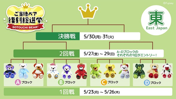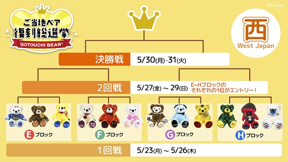 2022年は、全国各地の観光地などで販売している「ご当地ベア」の10周年を記念して、様々な企画を予定しております。今回の総選挙は、東西に分けたトーナメント形式で、5月23日(月)より1回戦を開始し、その後、2回戦、決勝戦を行い、5月31日(火)に結果を発表いたします。それぞれ1位に選ばれたご当地ベアは、数量限定で復刻販売する予定です。