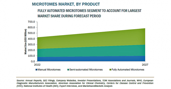 ミクロトームの市場規模は、2022年の4億2,500万米ドルからCAGR6.6%で成長し、2027年には5億8,500万米ドルに達すると予測されています。同市場の成長は、がん患者の有病率の上昇と、がん検診の高い需要によるもので、熟練した専門家の不足は、市場の成長を抑制する可能性があると考えられます。