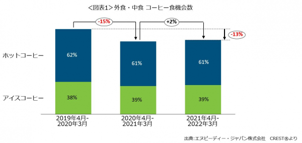 2021年4月-2022年3月計の外食・中食におけるコーヒーの食機会数(図表1)は、前年同期比で2%増加でしたが、コロナ前の2019年4月-2020年3月計比では13%減でした。コーヒーのホット/アイスの種類別では、ホットコーヒーとアイスコーヒーの構成比は大きな変化がありませんでした。
