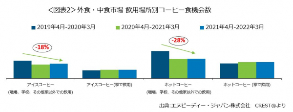 コーヒーの飲用場所別の食機会数の変化をみると(図表2)、「職場・学校・その他家以外での飲用」がホットコーヒーは、2021年4月-2022年3月に2年前同期比で28%減、アイスコーヒーは同18%減と大幅に減少しました。一方で、家での飲用機会は、増加しました。