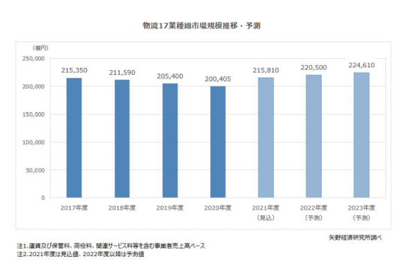 2021年度の物流17業種総市場規模は、前年度比107.7%の21兆5,810億円を見込む。