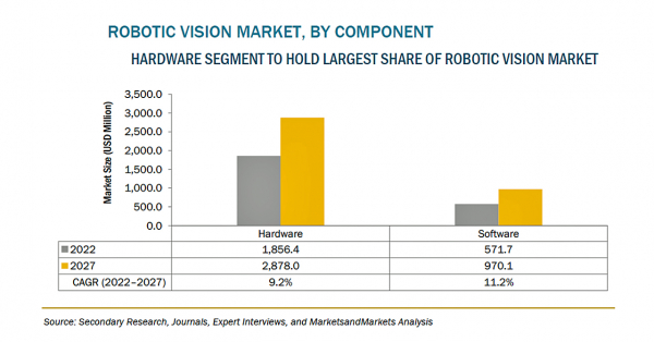 ロボットビジョンの市場規模は、2022年の24億米ドルからCAGR9.6%で成長し、2027年には38億米ドルに達すると予測されています。産業分野における安全性や品質に対する要求の高まりや、産業用ロボットにおけるビジョンシステムの採用が進んでいることが、市場の成長を促進する主な要因となっています。さらに、カスタマイズされたシステムへの要求の高まりや、機械学習や人工知能の利用率の上昇も、ロボットビジョンシステムを進化させており、近い将来、需要が高まることが予想されます。