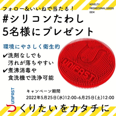 当社はこの度、インスタグラム運用1周年を記念して、2022年5月25日(水)より、「SNSキャンペーン」を実施します。当キャンペーンでは、当社の公式インスタグラムアカウントをフォロー、キャンペーン対象の投稿の「いいね!」するだけで応募が完了。当社製作のオリジナル『シリコンたわし』を抽選で5名様にプレゼントいたします。