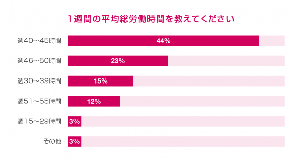 1週間の平均総労働時間について聞いた質問では、「週40~45時間」との回答が最も多く、44%。2位「週46~50時間」(23%)、3位「週30~39時間(15%)でした。1日8時間、週5日間勤務と考えると多くの会社員が効率良く働いているようです。