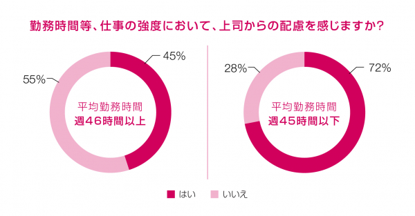 1週間の平均総労働時間が週46時間以上と回答した会社員は、55%が「勤務時間や仕事の強度が負担にならないよう、上司からの配慮はない」と回答しました。反対に平均総労働時間が週45時間以下では、72%が「上司からの配慮」があると回答。上司のなんらかの働きかけが会社員の労働時間に影響を及ぼすことが示される結果でした。