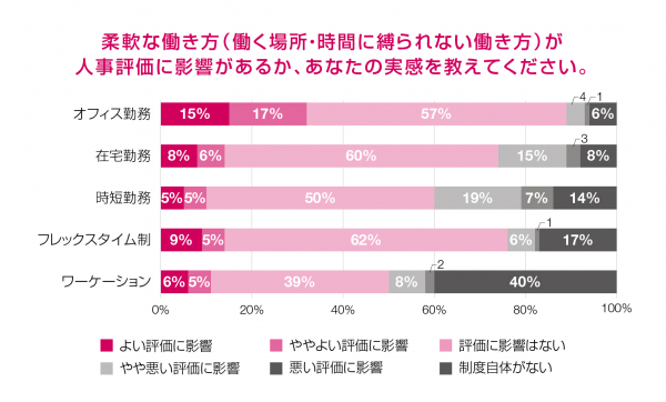 柔軟な働き方自体が人事評価へ影響することは多くはないものの、働く時間が短いことが人事評価へ悪影響があると考える会社員が一定数いることが分かりました。