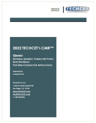 米国の半導体・電子材料市場の専門調査会社Techcetが出版した「半導体向け石英市場調査 2022年:半導体向け材料セグメント、二次加工品、母材 - QUARTZ: MATERIAL SEGMENT, FABRICATED PARTS, BASE MATERIALS FOR SEMI-CONDUCTOR APPLICATIONS」は石英(クオーツ)市場、特に半導体製造向け石英市場を調査し、半導体向け材料、二次加工品、母材などに関する調査・分析結果を掲載しています。また関連企業情報も提供します。
