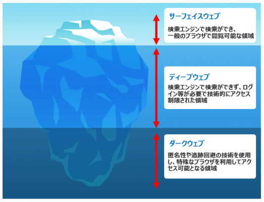 通常インターネット上の領域には、一般的にWebブラウザから検索エンジンで検索して参照ができるWebサイト等の「サーフェイスウェブ」と呼ばれる領域と、それ以外で「ディープウェブ」や「ダークウェブ」と呼ばれる領域があります。その中でも「ダークウェブ」は、アクセスの制限や匿名性の保持等、特別な仕組みで構成されており、一般的にはそのアクセス方法どころか存在も知られていないのが現状です。