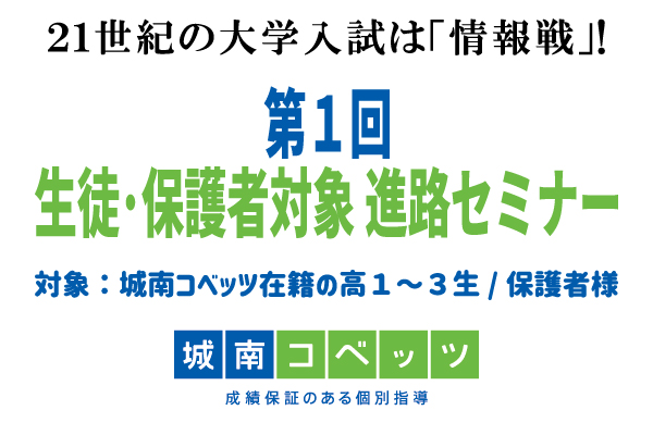 そこで「城南コベッツ」では、大学入試を有利に進めるために必要な最新情報・ノウハウを提供するガイダンス「第1回 生徒・保護者対象 進路セミナー」を、在籍生とその保護者の方限定で実施することといたしました。「城南コベッツ」は、1961年に開校した大学受験対策予備校「城南予備校」を母体とした個別指導塾で、全国で240教室を展開(2022年5月現在)。今回のガイダンスでは、高校生指導で60年にわたって蓄積されたノウハウをオンラインで提供いたします。