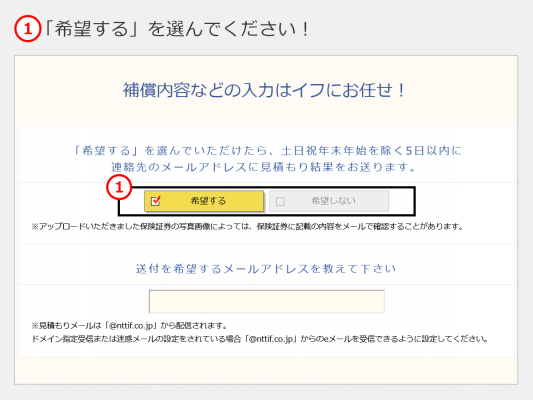 「イフにお任せサービス」とは、お客さまが自動車保険の証券を撮影後に写真をアップロード(サイトへ送信)していただき、3つの項目を入力いただくだけで、自動車保険のお見積もりをメールでお届けするサービスです。お客さまが送信していただいた証券画像を基に経験豊富なNTTイフのコールセンタースタッフがお見積もりをお手伝いいたします。