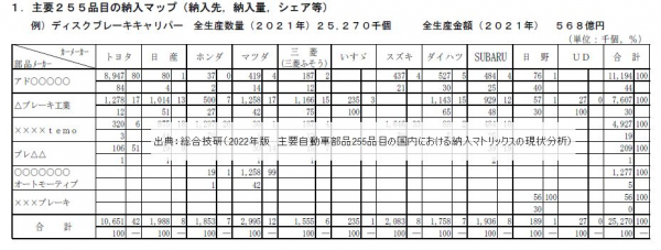 「2022年版 主要自動車部品255品目の国内における納入マトリックスの現状分析」は主要自動車部品255品目を エンジン部品、電気・電装部品、 ハイブリッド車用部品、電気自動車用部品、燃料電池車用部品、駆動・伝動部品、懸架・制動部品、 車体部品、計8種のタイプで章を分け、主要自動車部品255品目の各部品について、部品メーカー(一次)からカーメーカーへの納入先および納入量/状況をまとめています。