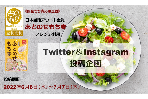 一般社団法人日本雑穀協会(東京都中央区)は、国産もち麦応援企画として、日本雑穀アワード2022《一般食品部門》金賞受賞商品『あとのせもち麦』をごはん、サラダ、スープ、スイーツ等にアレンジ利用した、Twitter&Instagram投稿企画を実施いたします。
