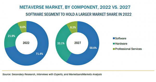 メタバースの市場規模は、2022年の618億米ドルからCAGR47.2%で成長し、2027年には4,269億米ドルに達すると予測されています。メタバース市場の成長を促進する主な要因としては、メディアやエンターテインメント、ゲーム業界における需要の増加、バーチャルリアリティ(VR)、拡張現実(AR)、複合現実(MR)などの隣接市場の発展的機会、アート、ファッション、小売業界におけるデジタル化などが挙げられます。これらの主要な要因は、業界やエンドユーザーに対して、メタバースによる範囲、到達範囲、提供物を大きく拡大させます。さらに、ゲーミフィケーションと仮想世界シミュレータを使用したプロモーションのためのブランドによるシフトは、エンドユーザーに最適な経験と取引を作成するように技術主導のエコシステムを提供しながら、最先端のインフラ設計、3D環境の改修と改善を再構築するため、メタバースベンダーを急増させました。