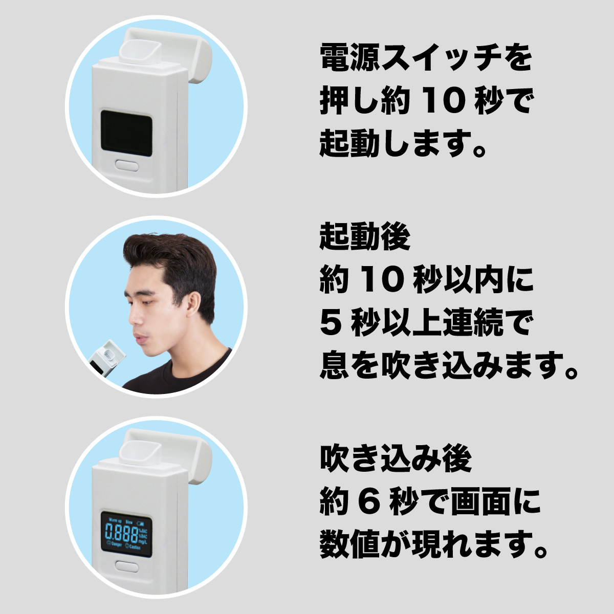 息を拭きかけて測定できます。また、複数人で使用する場合にはストローを取り付けて測定すれば衛生的に測定できます。※測定した数値は飲酒の有無の判断材料であり、運転の可否を判断するものではございません。