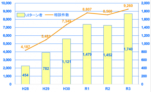 令和3年度のU・Iターン者は1,740人。年々増加しており、令和3年度は過去最高のU・Iターン者数となりました。