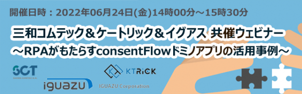 三和コムテック株式会社(本社:東京都港区、代表取締役社長:柿澤 浩介、以下 三和コムテック)は、2022年6月24日(金)に「三和コムテック&ケートリック&イグアス共催ウェビナー ~RPAがもたらすconsentFlowドミノアプリの活用事例~」ウェビナーをケートリック株式会社(本社:東京都目黒区、代表取締役社長:田付 和慶、以下 ケートリック)、株式会社イグアス(本社:神奈川県川崎市、代表取締役社長:矢花 達也、以下 イグアス)と共同開催いたします。