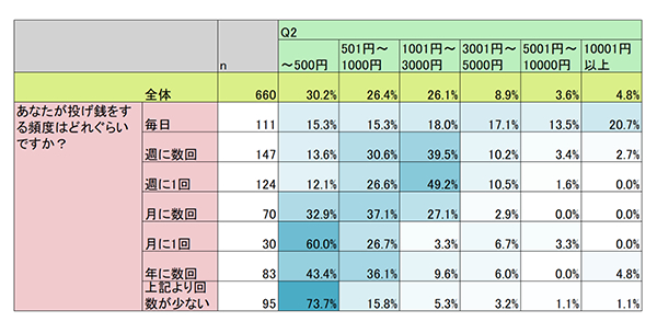 投げ銭の頻度が高いという回答者は、投げ銭の額も高い傾向があることが分かりました。