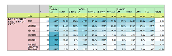 また、投げ銭の頻度が高い方のほうが様々なプラットフォームを利用して投げ銭を実施している様子も見られます。