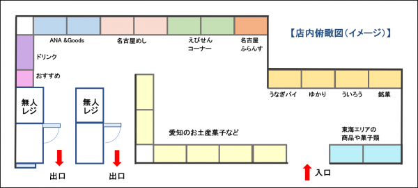 入口付近に東海エリアを代表する銘菓、店内を進むと知多半島などのえびを使った「えびせんコーナー」や名古屋のグルメを取り揃えた「名古屋めしコーナー」、ANAオリジナルグッズや雑貨、飲料を品揃えいたします。特にメインとなるお土産菓子は選びやすさを追求し、価格帯別に陳列することで目的に合ったお買い物がしやすくなっています。