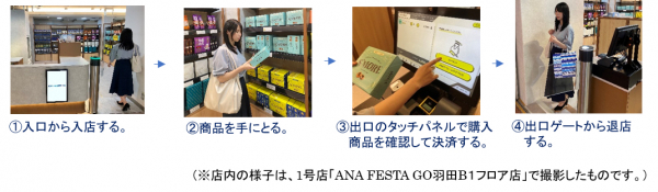 ※ウォークスルー型の店舗で、カメラなどの情報から入店したお客様と手に取った商品をリアルタイムに認識して、決済エリアにお客様が立つとタッチパネルに商品と購入金額が表示され、表示内容を確認して支払うだけでお買い物ができる店舗のこと