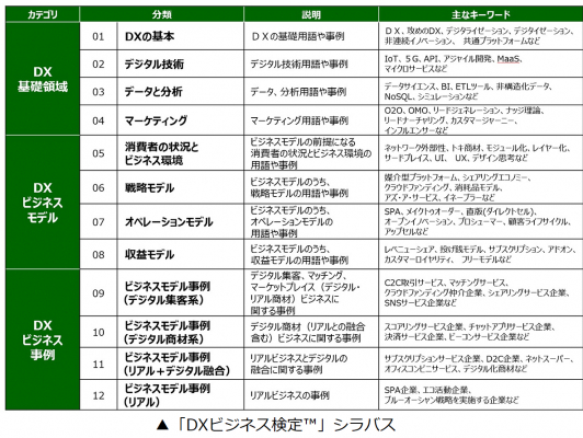 ・試験概要:DX時代の全ての企業人財のDXビジネス力を全分野から統合的に可視化する検定。また、基礎的なDXビジネス分野から、DXビジネス理論、マーケティング用語、DXビジネスモデル、DXビジネス事例などから幅広く出題されます。