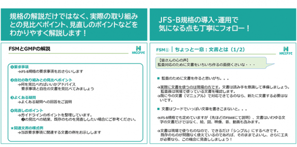 ・例えば、事業者に設置されたHACCPチーム向けにJFS-B規格を解説、現場作業員向けに食品衛生の基本を解説、など