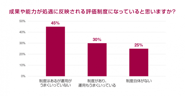 高齢化社会が進み、人事評価制度は年功序列制度から成果主義や能力主義へと移行している企業が多いようですが、実際に「成果や能力が処遇に反映される評価制度になっている」と回答した会社員は、約3割でした。「制度はあるが運用がうまくいっていない」は45%、「制度自体がない」は25%となりました。
