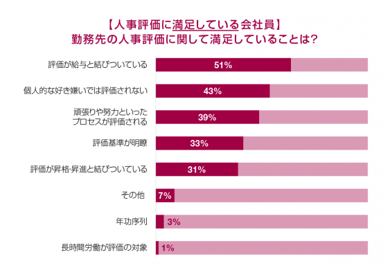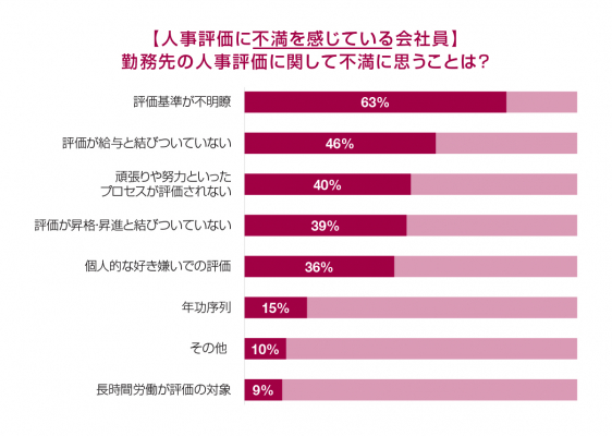 「満足」している内容としては、1位「評価が給与と結びついている」(51%)、2位「個人的な好き嫌いでは評価されない」(43%)、3位「頑張りや努力といったプロセスが評価される」(39%)でした。反対に人事評価に「不満」を感じていると回答した会社員は、1位「評価基準が不明瞭」(63%)、2位「評価が給与と結びついていない」(46%)、3位「頑張りや努力といったプロセスが評価されない」(40%)を不満点として挙げています。