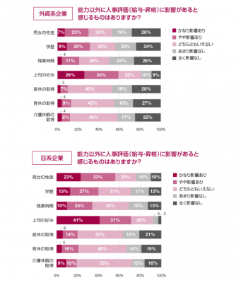 能力以外に人事評価(給与・昇格)に影響がある項目については、外資系企業に勤務する会社員の1位「上司の好み」(59%)、2位「学歴」(31%)、3位「男女の性差」(30%)でした。日系企業勤務では、1位「上司の好み」(72%)、2位「男女の性差」(56%)、3位「学歴」(40%)という結果でした。どの項目においても日系企業での回答が外資系企業より1割以上多いことから、日系企業では能力以外の部分が人事評価に影響を与える傾向があることがわかります。