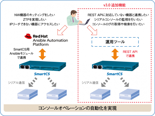 セイコーソリューションズ株式会社(代表取締役社長:関根 淳、本社:千葉県千葉市、以下 セイコーソリューションズ)は、コンソールサーバー「SmartCS」でREST APIに対応した新ファームウエア v3.0を開発し、2022年6月中旬以降に提供を開始します。今回のバージョンアップにより、さまざまな運用管理ツールとの連携機能を強化し、システム全体の運用自動化を実現します。