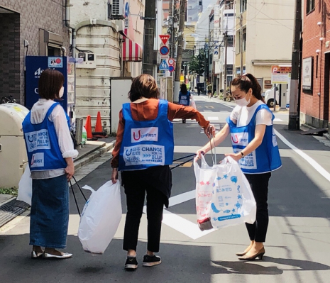 企業向けオリジナル販促グッズや各種バッグのOEM生産を手がけるユニファースト株式会社(本社:東京都台東区、代表取締役社長:橋本敦)は、環境にやさしい自社開発製品『着られるエコバッグ(※)』を着用し、2022年6月2日(木)に本社のある東京・浅草橋周辺にて「海ごみゼロウィーク」清掃活動を実施しました。