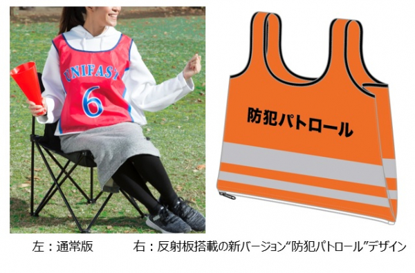 もともとはスポーツ観戦用として開発した商品ですが、仲間認識や一体感を得られる上に環境にやさしい製品とのことで大手企業の社員ボランティア活動にも採用されました。さらに”つくる”を通して社会に貢献するという当社の経営理念に沿って、昨年は「海ごみゼロウィーク」の清掃活動に合わせて社員の清掃ボランティア活動のユニフォームとして『着られるエコバッグ』の“海ごみゼロウィーク”デザインを制作しました。今年は反射材を搭載した『着られるエコバッグ』の“防犯パトロール”デザインも製作し、防犯パトロール活動の応援を目的として寄付先を募集しています。