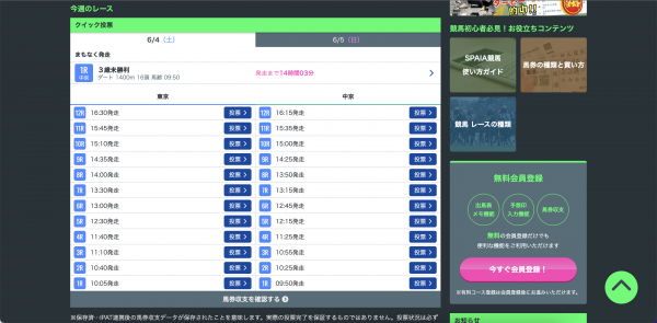 SPAIA競馬をより快適に利用していただくため、トップページに「クイック投票」機能を追加しました。トップページより土日開催のレース一覧を表示いただくと、直近のレース開催が上部「まもなく発走」に表示されます。各レース横の投票ボタンからすぐにオッズ入力画面に移動することができ、IPAT 連携までスムーズな入力が可能です。