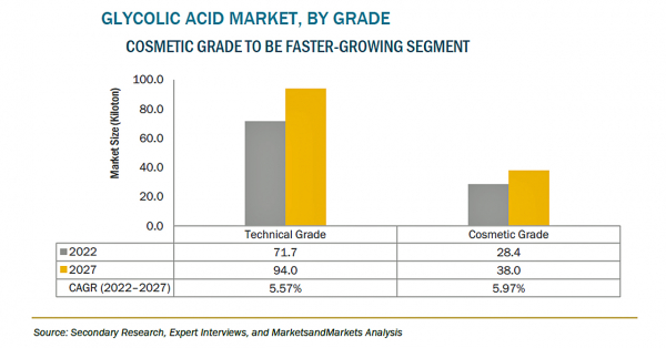 グリコール酸の市場規模は、2022年の3億2,700万米ドルからCAGR6.6%で成長し、2027年には4億5,000万米ドルに達すると予測されています。グリコール酸は、天然または合成ルートから得られるα-ヒドロキシル酸(AHA)の一種で、純度を変えてケミカルピーリング、アンチエイジングクリーム、ヘアケア、スキンケアクリームなどの用途に広く使用されています。近い将来、最終用途からの需要増加により、同市場は拡大することが予想されます。