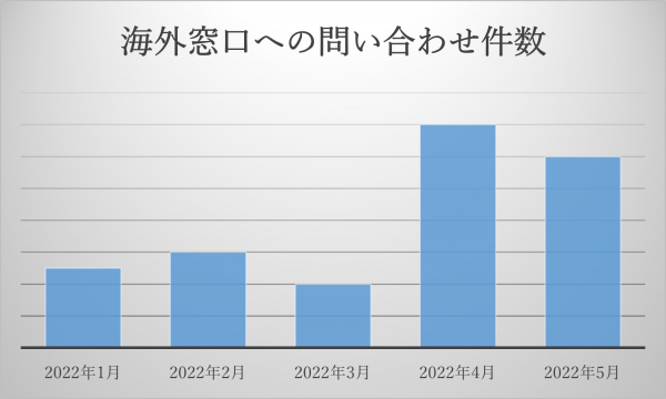 特に2022年3月から4月は前月比3.5倍と増えており、その後も問い合わせは増えている状況です。国別にみるとアメリカ、イギリスからのお問い合わせが増えています。