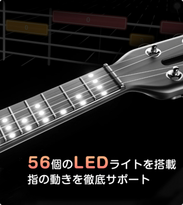 ▲ネックに搭載された56個のLEDライトが指の動きを導きます!さらに、アプリ画面では右手のピッキングをサポート。