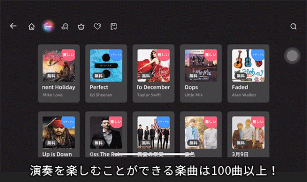 ▲演奏を楽しむことができる楽曲は100曲以上! APPで演奏を記録して復習したり、演奏をシェアすることもできます。