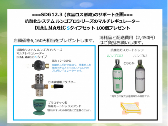 このたび医療機器・食品装置を開発・開発支援する株式会社バルクレップインターナショナル(本社:東京都渋谷区、代表:向 英俊)はSDG12-3(食品ロス削減)を微力ながら支援するため、飲食品のロングライフ化を卓上でサポートする抗酸化システム ルンゴプロシリーズの「マルチレギュレーター DIAL MAGIC Sタイプ(出力30PSI)およびその備品(6,160円相当)」を100名様にプレゼントします。ただし、それを使用するために必要な消耗品の抗酸化ガスカートリッジおよび配送費用合計(2,450円)のご負担をお願いします。