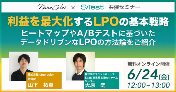 株式会社グラッドキューブ(本社:大阪市中央区 代表取締役 CEO 金島 弘樹 以下:グラッドキューブ)は、株式会社nano color(本社:大阪府大阪市、代表:川端 康介)と共催で、6月24日 (金) 12:00~ 利益を最大化する LPO の基本戦略をテーマにオンラインセミナーを開催いたします。